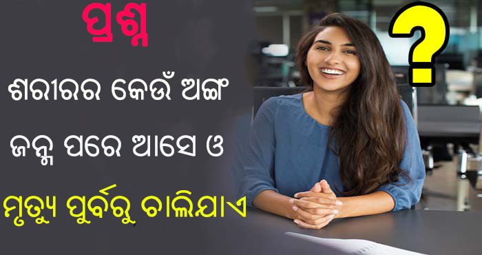 ୪) ଶରୀରର କେଉଁ ଅଙ୍ଗ ଅଛି ଯାହା ଜନ୍ମ ପରେ ଆସେ ଓ ମୃତ୍ୟୁର ପୁର୍ବରୁ ଚାଲିଯାଏ ? ଉତ୍ତର : ଆମର ଦାନ୍ତ ଜନ୍ମ ପରେ ଆସିଥାଏ , ଓ ମୃତ୍ୟୁ ପୂର୍ବରୁ ଭାଙ୍ଗିଯାଏ ।