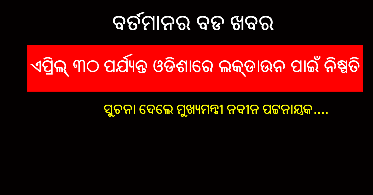 ରାଜ୍ୟସରକାର ଙ୍କ ବଡ ନିଷ୍ପତି – ଏପ୍ରିଲ ୩୦ ଯାଏ ଲକ ଡାଉନ ବଢିବା ପାଇଁ ନିଷ୍ପତି – ଦେଖନ୍ତୁ କଣ କହିଲେ ମୁଖ୍ୟମନ୍ତ୍ରୀ ….