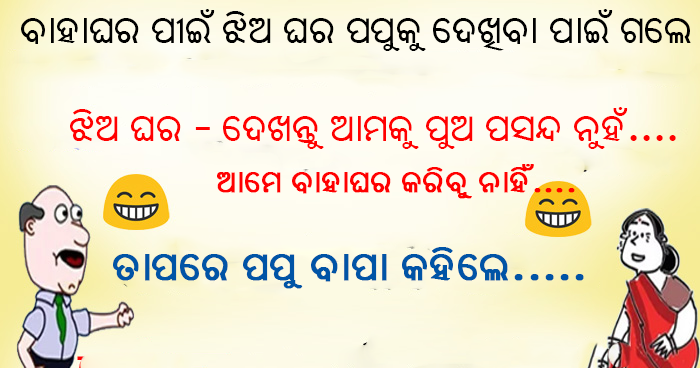 1 – ବିବାହ ନିମନ୍ତେ ଝିଅ ପକ୍ଷ ପପ୍ପୁକୁ ଦେଖିବାକୁ ଗଲେ | ଝିଅ ପକ୍ଷ- ଦେଖନ୍ତୁ ଆଜ୍ଞା , ଆମକୁ ପୁଅ ପସନ୍ଦ ନୁହେଁ | ସେତେବେଳେ ପପ୍ପୁ ବାପା କହିଲେ…ପପ୍ପୁର ବାପା- ପୁଅ ତ ଆମକୁ ମଧ୍ୟ ପସନ୍ଦ ନୁହେଁ… ଏବେ କଣ କରିବା ଘରୁ ବାହାର କରିଦେବୁ!!!